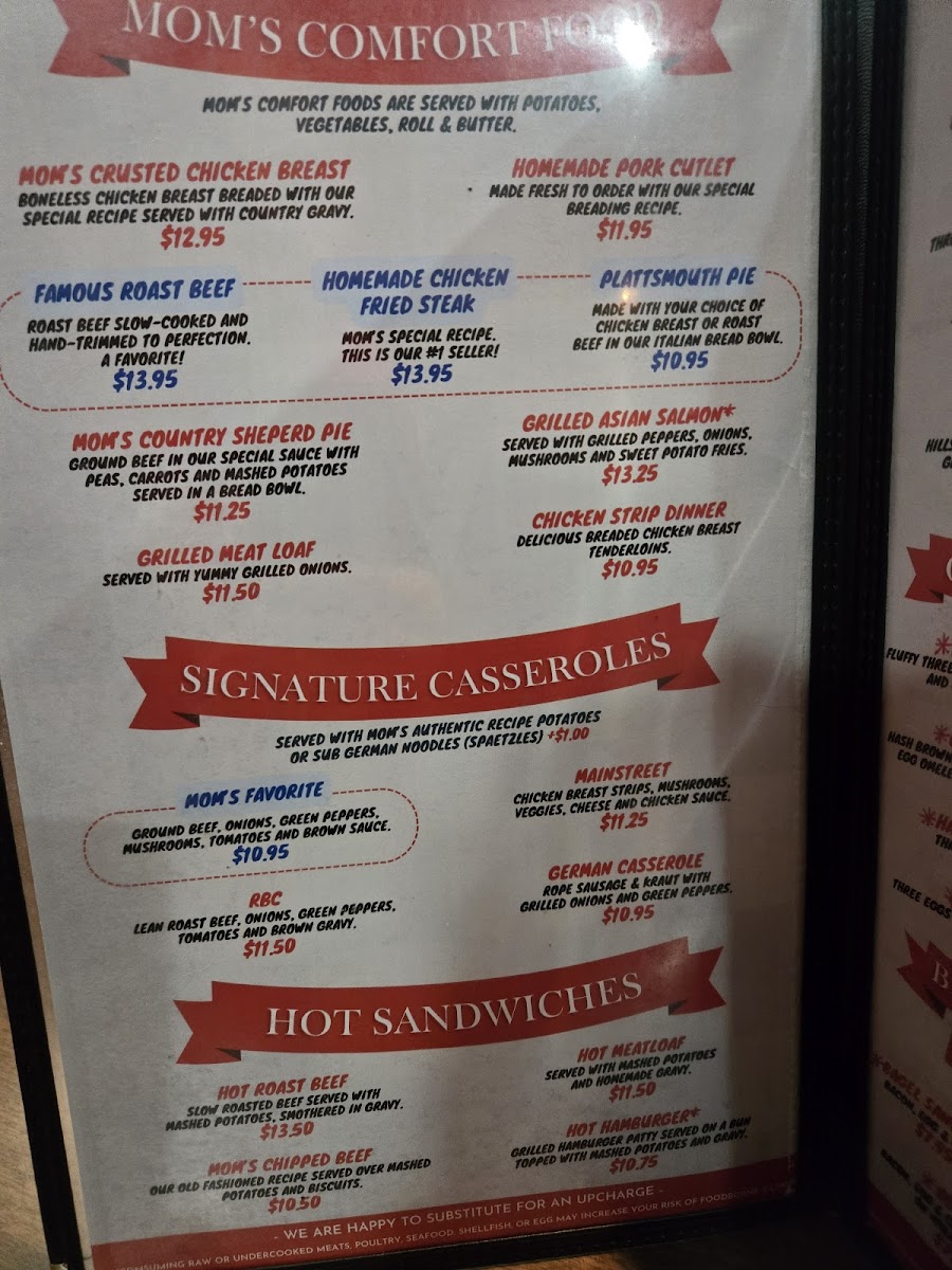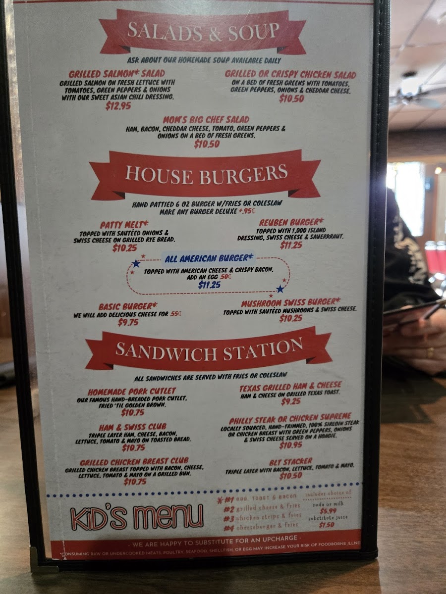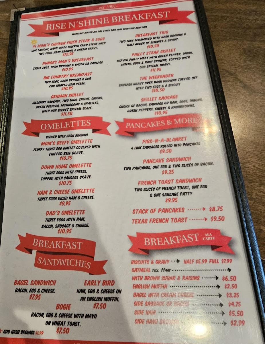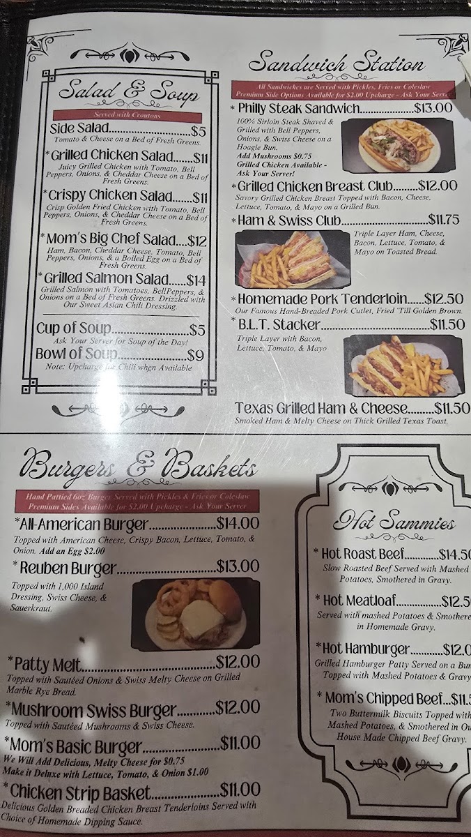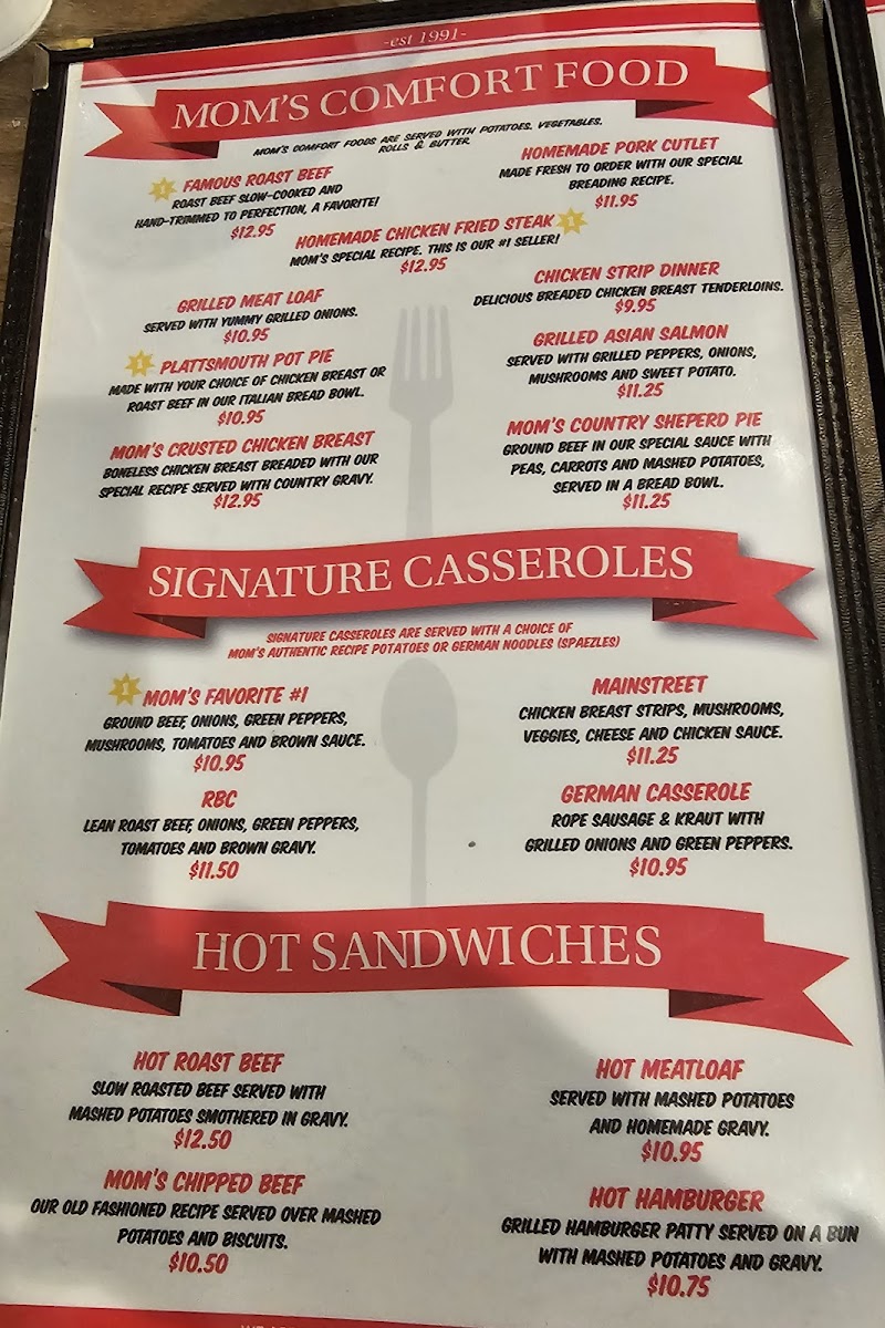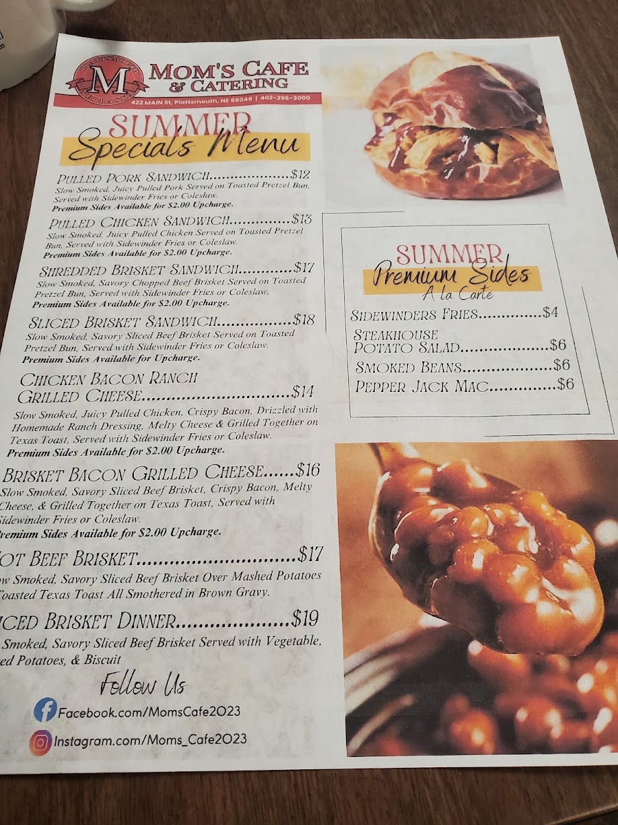 The menu aligns with the welcoming environment where portions are generous, food is straightforward and hearty, and the experience feels much like sharing a meal with family. Whether enjoying breakfast early or settling in for a casual lunch, Mom’s Cafe & Catering’s menu encourages simple, satisfying moments in a comfortable setting.