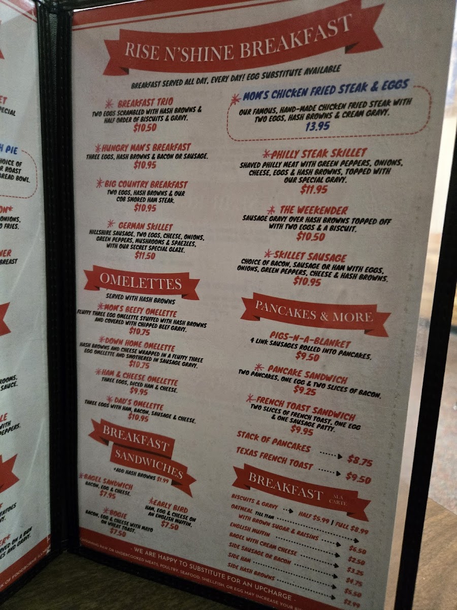 Accompaniments like creamy biscuits and gravy, crispy hashbrowns, or seasoned Sidewinders Fries round out the experience, offering comforting flavors that invite lingering at the table. For those with a sweet tooth, classic desserts like Chocolate Pie and Pumpkin Pie provide a gentle finish that keeps the mood easy and familiar.